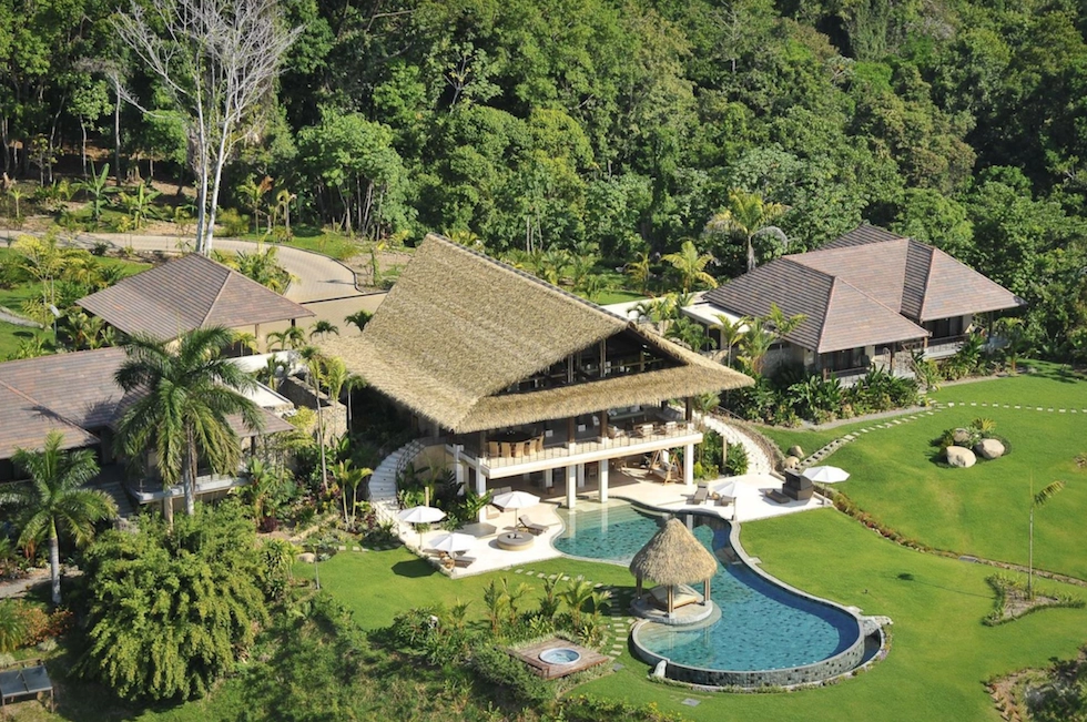 Villa Mayana is nestled within the 75-acre Achiote Private Reserve. Set high atop one of its cliffs, it gets views of the Pacific on one side and the lush mountains on the other. It’s just steps away from Hermosa Beach and near “Whale’s Tail,” the famous reef in Ballena National Park. As a result, guests get privacy and access to activities in one of the most biodiversity-rich areas in the world. The perimeter of the house includes a fire pit, an outdoor kitchen with a dining area, a table tennis set, and a 3,000-square-foot infinity pool. Additionally, guests can explore the grounds and enjoy the orchard or take the hiking trail to a nearby waterfall. On the inside this luxury villa has marble floors, thirty-foot ceilings, and a mix of both local and Balinese furnishings. The six bedrooms feature spacious bathrooms, indoor and outdoor showers, and wrap-around balconies.