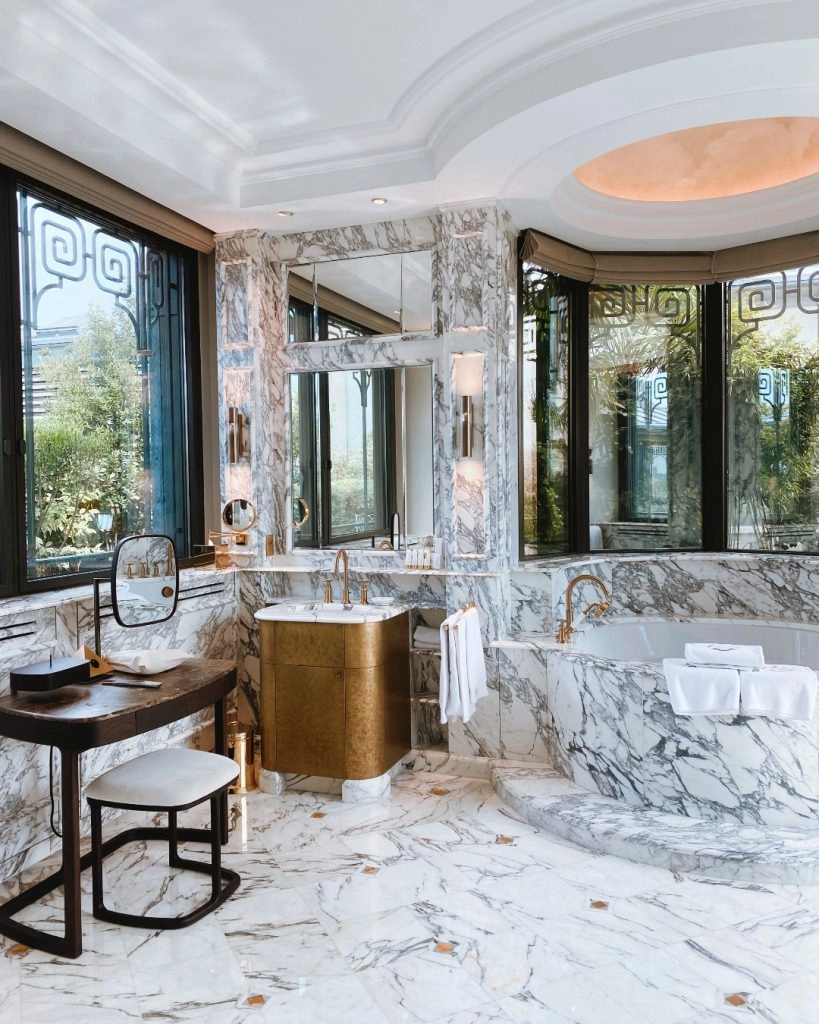 Le Meurice’s Belle Etoile Penthouse Suite translates to ‘Beautiful Star.’ And with a rooftop terrace that wraps around, you’ll be closer to the stars than most. Nods to the Penthouse name are made with views of the Eiffel Tower sparkling at night and chandeliers around each corner. The suite blends modern furnishings with timeless French accents. For instance, the staircase mimics the branches of Tuileries Garden trees. But the marble bathroom with a whirlpool bathtub is the focal point. It’s the kind of place to make it onto bucket lists with the whole city as your view.