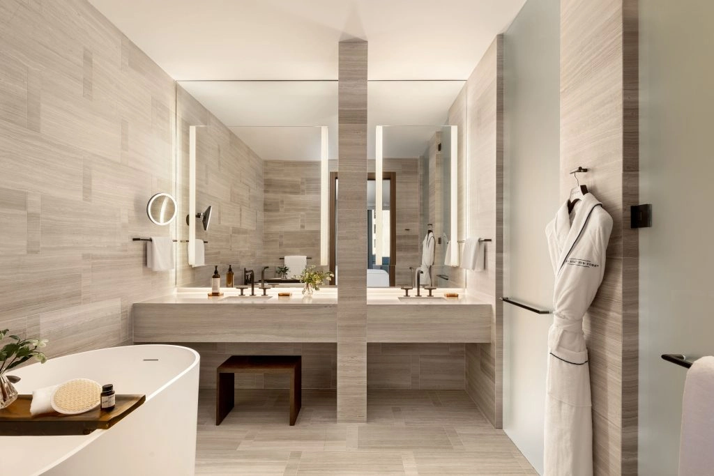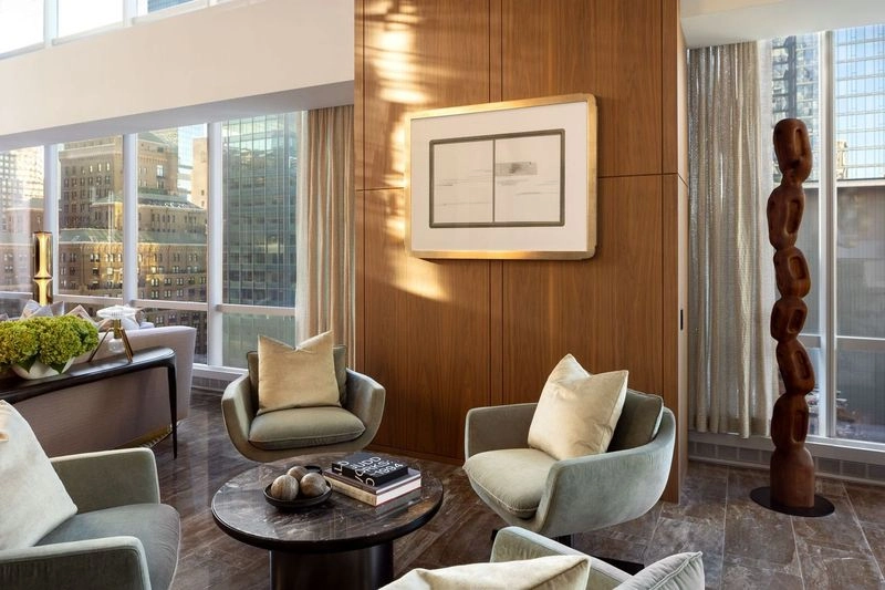 An entire wing of the hotel’s 25th floor is dedicated to the Manhattan Suite and connecting rooms. The 3,500-square-foot accommodation has three bedrooms, three bathrooms, two powder rooms, and two balconies. You’ll have sweeping city views no matter where you are in the suite. Whether it’s the NYC skyline you’re after, or people-watching over Central Park, the panoramic views will make you feel like you own it. Design group Sawyer & Company’s vision involves juxtaposing grand spaces with an intimate feel. For instance, you’ll have 18-foot floor-to-ceiling windows and all the makings of a home kitchen. Better yet, this kitchen comes with premium Miele appliances. There’s also a fully-stocked bar with a renowned wine selection. The bedroom is also impressive, with Bryte Balance king-size beds and AI features for jetlag and sleep aid. The bathroom has a marble soaking tub, a rainshower, a Toto electric toilet, and heated floors.