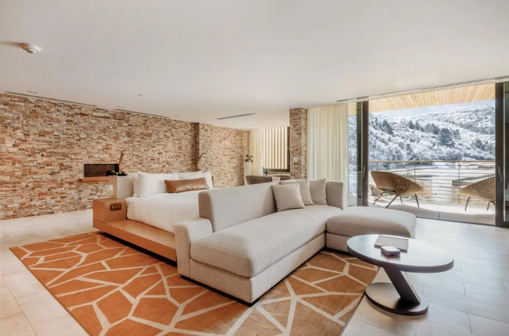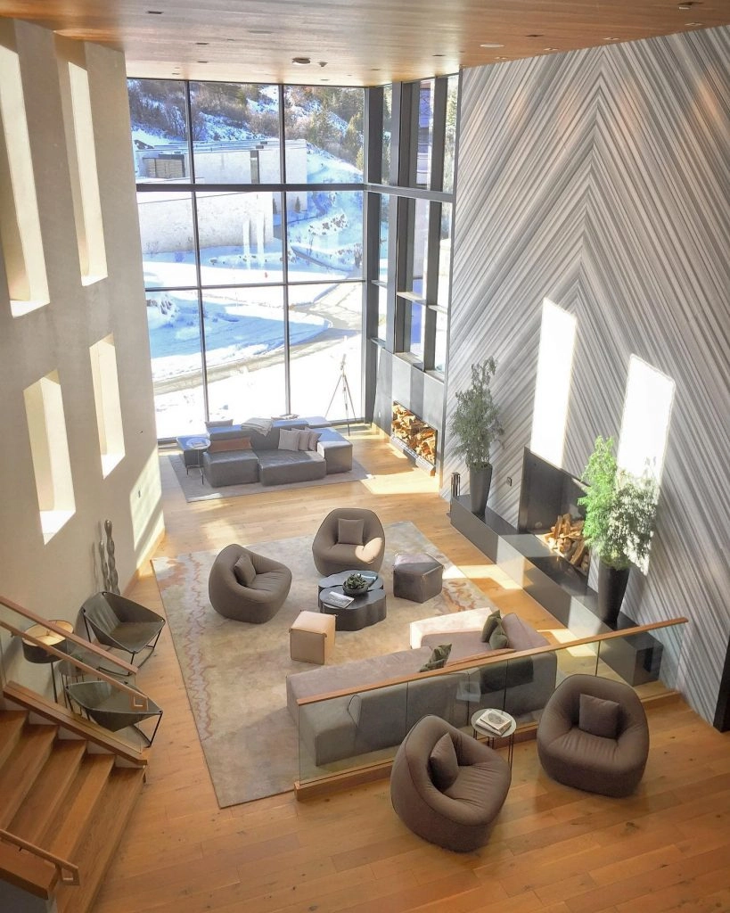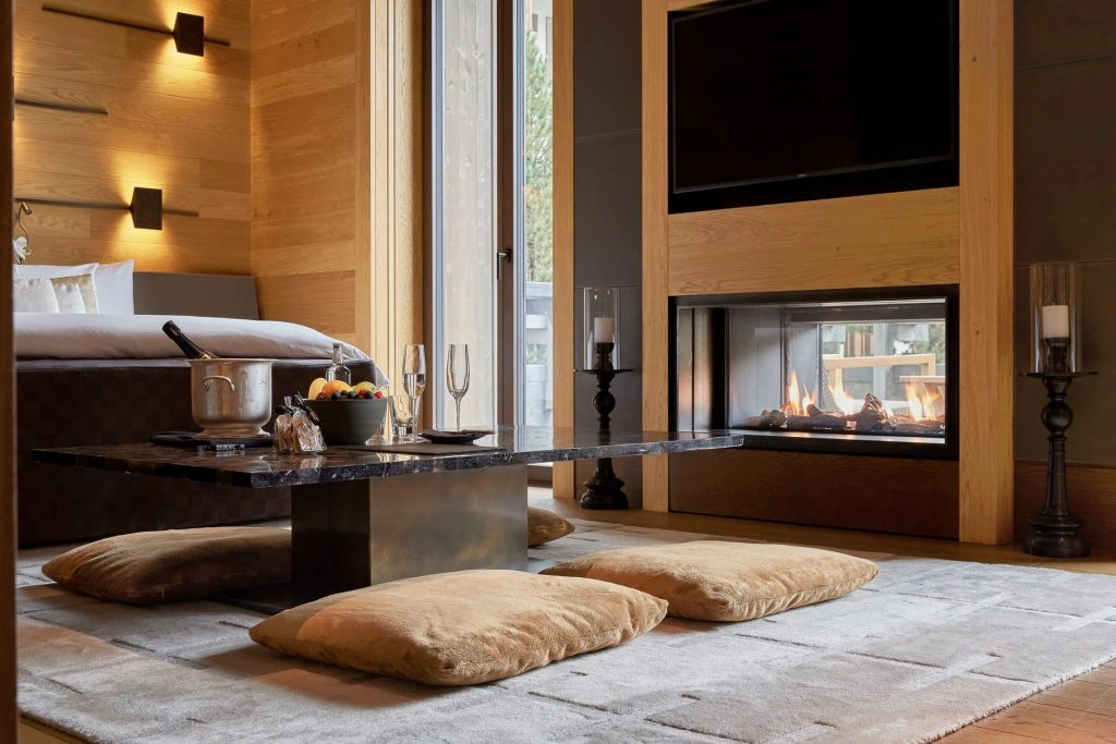 The Chedi Andermatt collects accolades, and not just for its stunning fireplaces. It’s one of the best ski lodges in the world, with top ratings in wine, wellness, and overall luxury. The Chedi’s unique design blends Asian sleek modernity with Alpine chic seamlessly. So, it’s no surprise that the fireplaces are impressive, and plentiful with its Swiss mountain location. In the main living room, couches are covered with fur blankets and encircle a wood-burning fireplace in the center of the room. It’s the kind of spot that you want to curl up with a cup of tea or a gluwein. And if you don’t want to leave your suite, every room has a gas fireplace that roars with the flip of a switch.