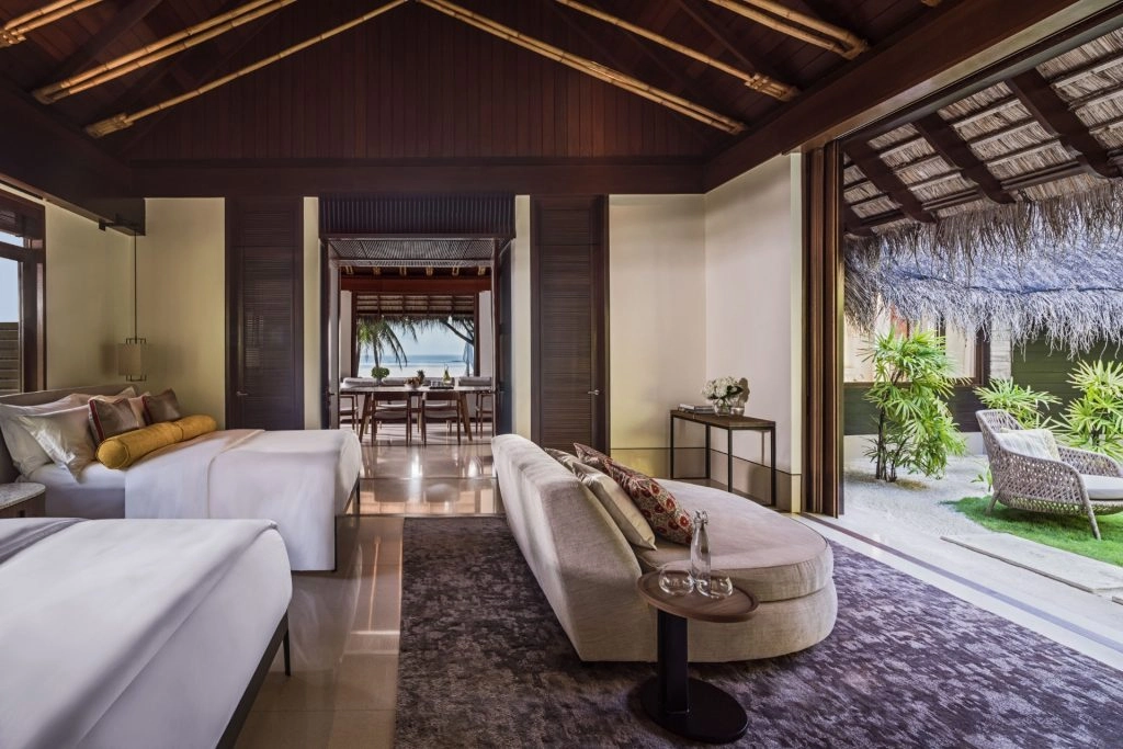 Rooms are contemporary-designed private villas, set both overwater and on the white-sand beaches. The overwater villas feature direct access to the Indian Ocean. Whichever you choose, there are lavish interiors with high-end furnishings, private pools, spacious outdoor terraces, and ocean views. The natural materials and earthy tones give tranquil and serene vibes.