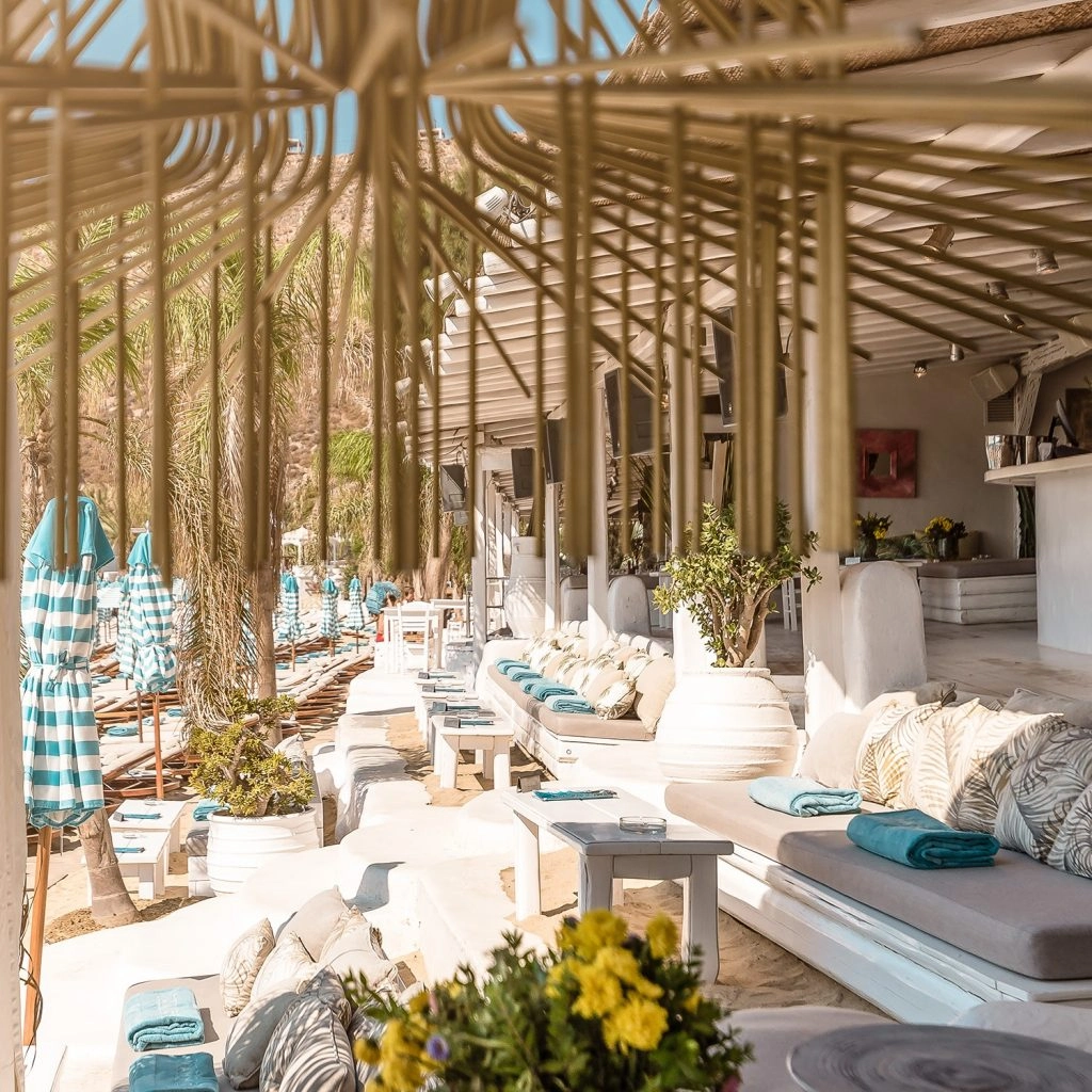 If there’s a beach club that defines the scene of Mykonos, it’s the exclusive Scorpios. Scorpios is the classic standby that has that Greek Cycladic rustic feel that is elevated with a gorgeous beach club and people to match. Nowadays, it’s connected to the Soho House, which has a beach hotel next door. During the season, there’s more velvet rope and exclusivity. Of course, the exclusivity is no problem for Jessica Alba on vacation in Mykonos to make it through the gauntlet for entrée. However, come September, it becomes a sublime place to chill for the day with more locals but still a beautiful scene.