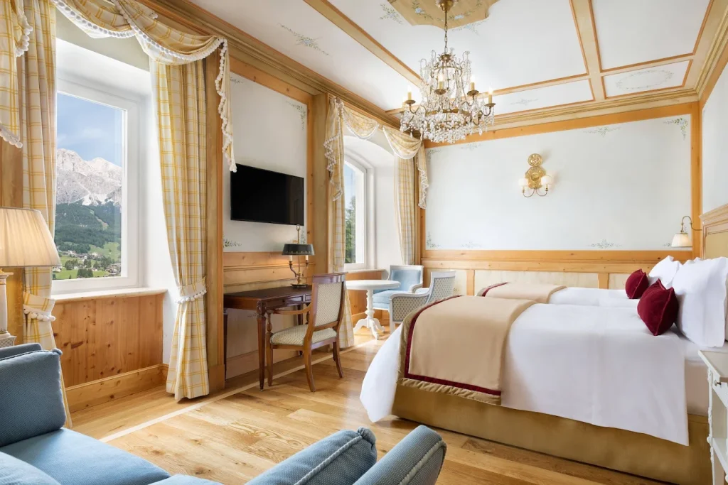 Cristallo Resort & Spa is Cortina’s grande dame — the first true five‑star luxury hotel in the Dolomites. It has a long reputation for classic elegance, a full wellness center, and panoramic mountain views. To this day, it remains one of the area’s most established luxury stays, complete with an indoor pool, multiple restaurants, and spacious rooms with spa‑style bathrooms.