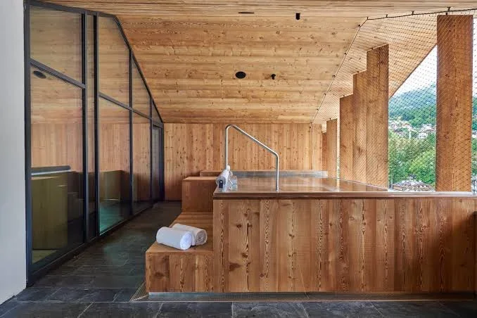 Hotel de Len brings a modern, sustainability‑driven approach to the center of Cortina. It’s built almost entirely around locally sourced wood, and clean, minimalist design. Opened in early 2022, you will recognize it for its wellness program and a rooftop spa that leans into the regenerative power of the mountains.