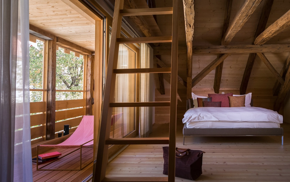 Casa Caminada is in Fürstenau, the smallest town in the world. The region is surrounded by picturesque castles and green mountain valleys. But, the main draw of the area is the restaurant Schloss Schauenstein, which won 3 Michelin stars and 19 Gault Millau points. The food takes its inspiration from the Grison Alps and features local ingredients. Casa Caminada is conveniently located next door to the restaurant and is great for a short trip to the area. Their light-filled rooms are made from larch wood and have a minimalist design. Their own restaurant serves traditional Swiss food cooked by a chef who previously worked at Schloss Schauenstein. Additionally, they have their own bakery, shop, and culinary cellar.