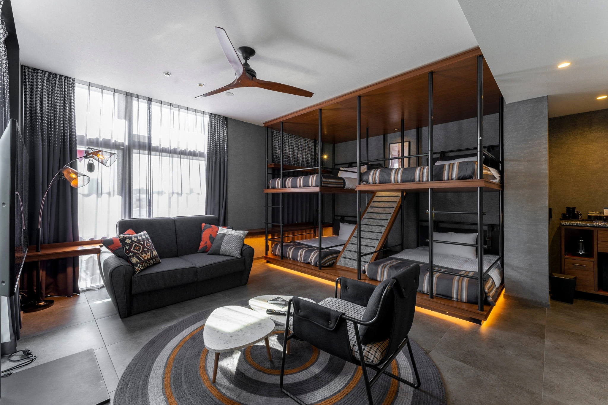 The Lively is in the center of the well-known Tokyo food district – Azabu-Juban. The neighborhood is a wealthy area with lowkey vibes for a quieter stay. That said, The Lively stays true to its name with a youthful, fun, and quirky energy. The avant-garde space is high-tech, with mobile text service, QR code payments, movie theater rooms, and Smart toilets. The playfulness is all in the design, with folding desks, hidden seating, lofts with slides, and vanities doubling as TVs. This boutique hotel has thought of everything, and we mean everything. There are over 100 amenities, from board games to pizza cutters, all a text away. The space encourages communal living with seating set up for socializing. For instance, the community table at the Okadamae restaurant that happens to serve rare Kuroge Wagyu Beef. The perfect blend of elegance and whimsy.