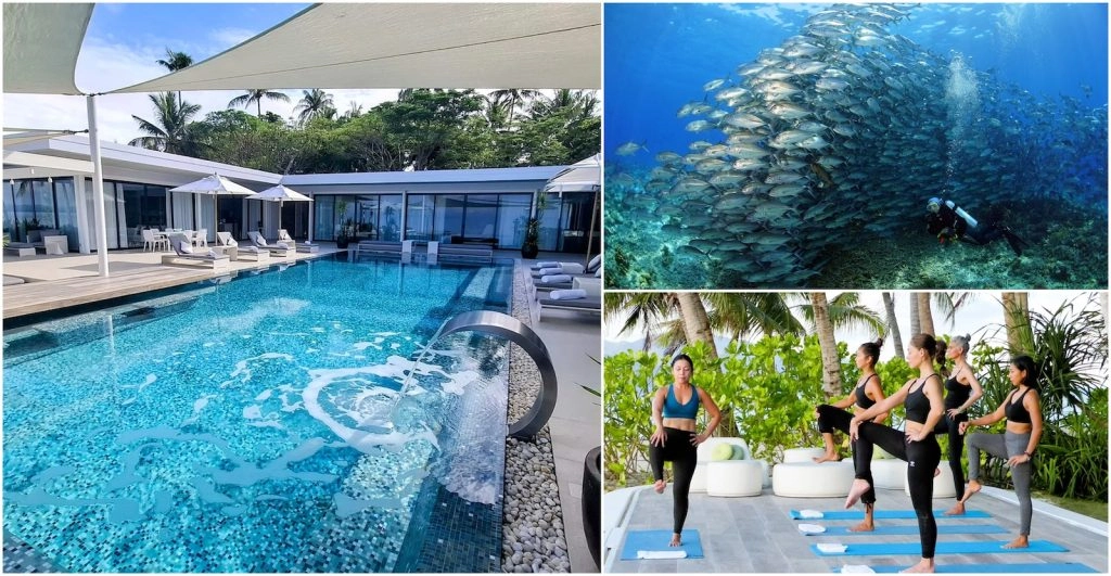 But there’s a lot more to Banwa Private Island than its striking villas. There’s a top-notch restaurant whose menu features ingredients from Banwa’s organic farm, and there’s a host of wellness facilities. From the gym to the pilates studio, the yoga platform, and the Meridian spa, you’ll have plenty of opportunities to indulge in serious self-care. For more sweaty and adrenaline-pumping endeavors, there’s a tennis court, a golf course, a table tennis corner, and, most importantly, a dive center. The waters around the island are teeming with colorful marine life.
