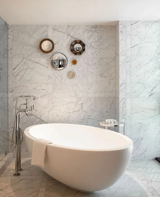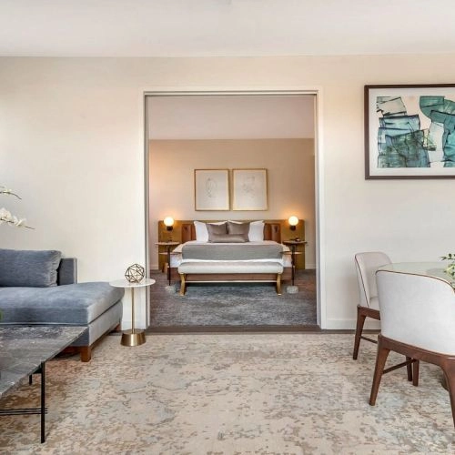 The rooms are split between river-view and city-view categories. These feature beds with luxury linens, a living room area for lounging, and a marble bathroom.