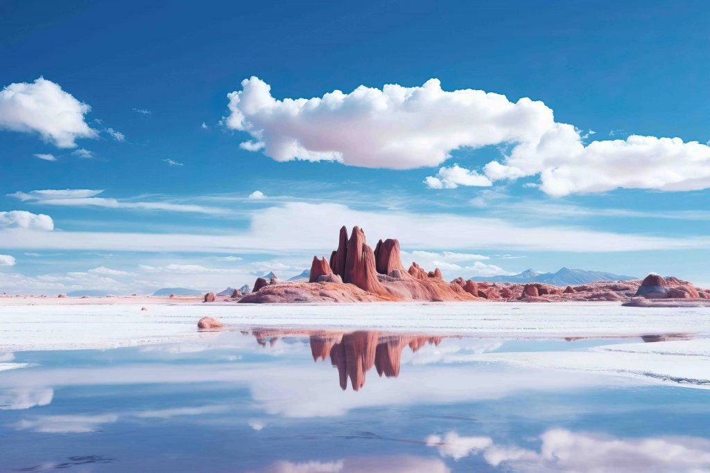 If you like stunning scenery and photos of a lifetime, then the Bolivian salt flats are for you. Salar de Uyuni is the world’s largest salt flat, located in southwest Bolivia spanning about 4,086 square miles. These salt flats are at an elevation of approximately 11,995 feet above sea level. The Uyuni Salt Flat was formed as a result of prehistoric lakes that dried up, leaving behind an immense, flat surface composed mainly of salt. During the dry season, the landscape resembles a vast, blindingly white desert, creating a surreal atmosphere.