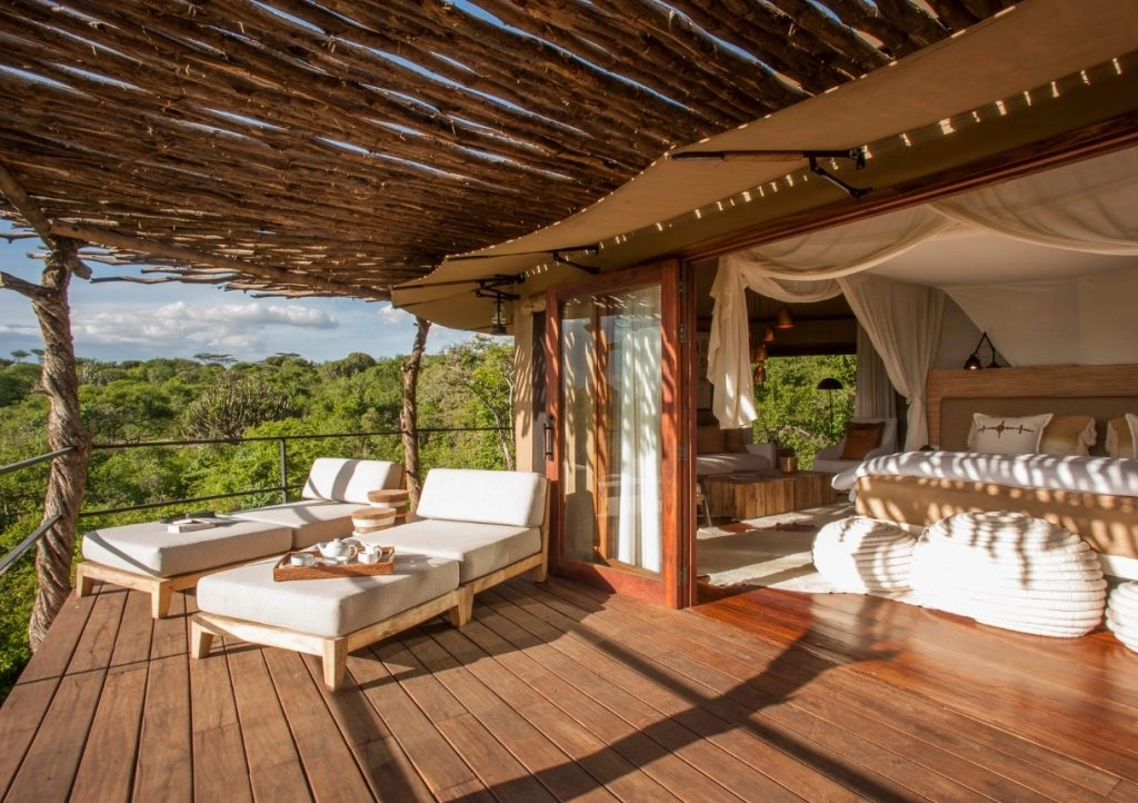 The Mwiba Lodge sits atop boulders surrounded by ancient coral trees, which gives you that tree-house feel. There are ten suites, and each has a private deck. While the suite’s exterior is tent-like, the inside has a polished look with light wood, gold accents, and cream-colored linens. Deep soaking tubs and highly thatched roofs also make for luxurious features. If you find yourself at the pool (and you will), it overlooks a natural spring where you can watch the wildlife sip the water. That way, you don’t have to find the wildlife; it comes to you.