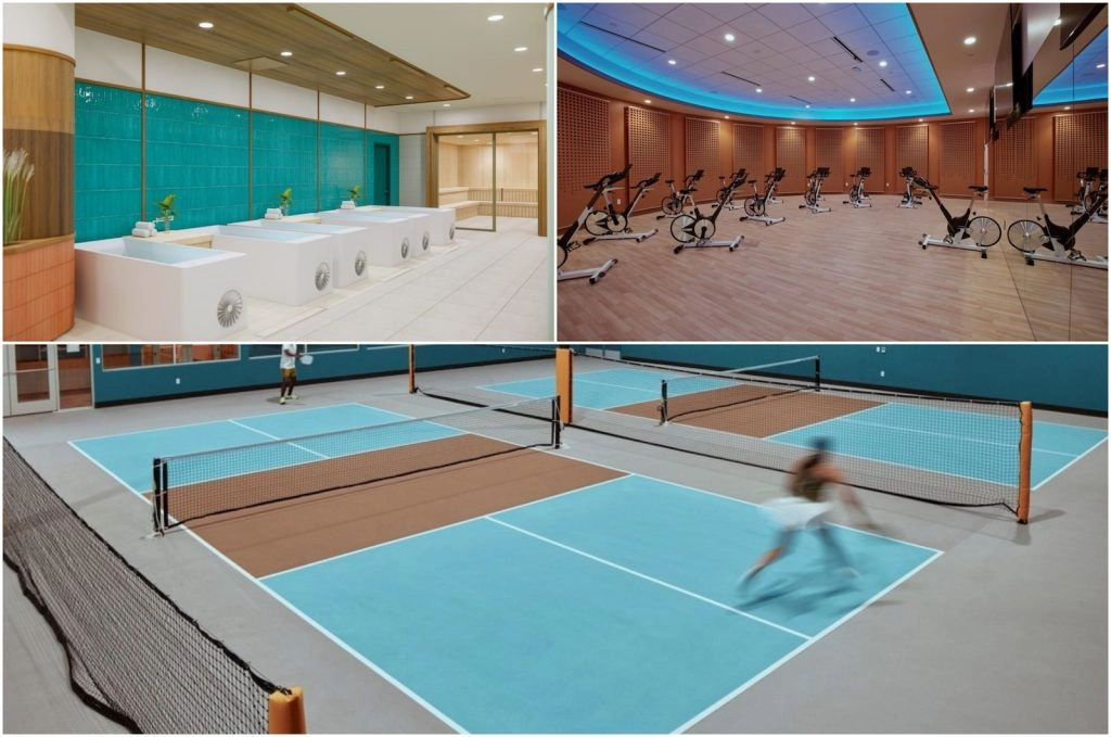 While the facility is equipped like a clinic, it’s much more fun than that. There’s a state-of-the-art gym, a fitness studio offering a variety of classes, saunas, cold-plunge baths, red light beds, and even a pickleball court. And like in any wellness club worth its salt, you can also get beauty treatments, massages, and tasty snacks at the café.