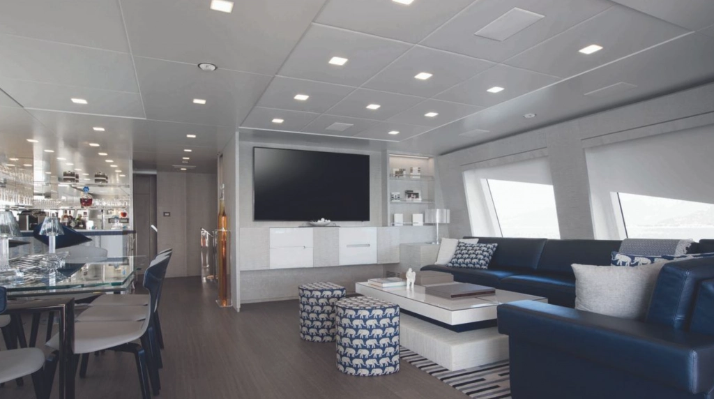 There are five cabin guest rooms aboard Yacht ‘H. The main deck master suite is a spacious 900 square feet with a king size bed. It’s views for days, because the suite is surrounded by large windows for taking in ocean and shore landscape. In addition, it features its own meditation room, a wide lounge bed, and a his and her en-suite bath. The rest of the guest rooms are located below deck with windows that showcase water level views. Two rooms have king beds and two have twin beds while each comes with its own en suite bathroom. Uniquely, some of these rooms can be connected to expand into a larger suite.