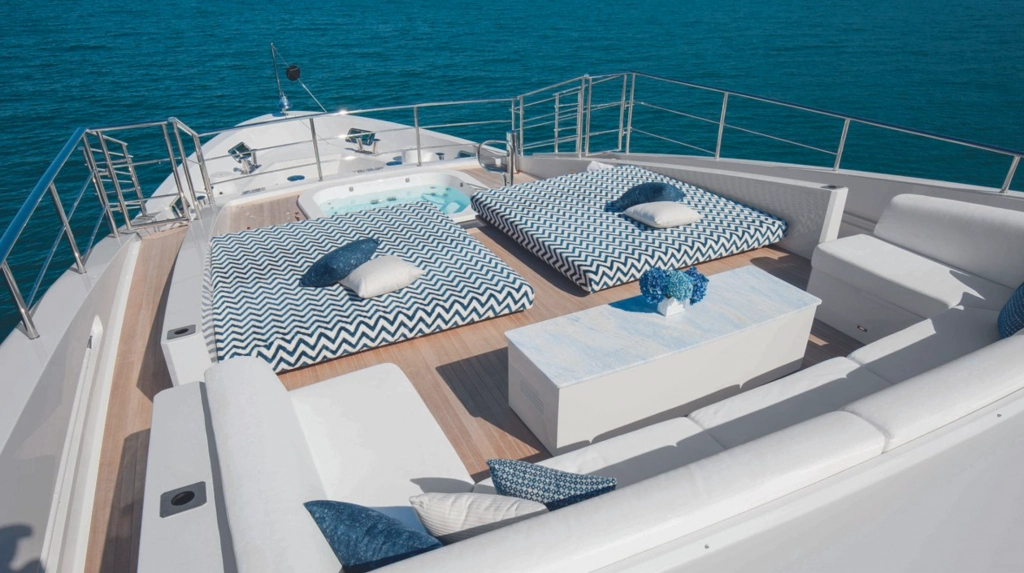 Guests will have their choice of five star meals prepared by the boat’s chef with options to dine both inside and out. The upper deck features a jacuzzi and sunpads for relaxing. If you get bored of that there are tons of other outdoor amenities aboard Yacht ‘H. This includes water skis, wakeboards, paddleboards, inflatable donuts, snorkeling gear, and fishing supplies. Not to mention a water slide that hangs off the side of the boat. For when the Yacht anchors by a beach there are volleyball sets, bocce ball equipment, and even soccer balls.