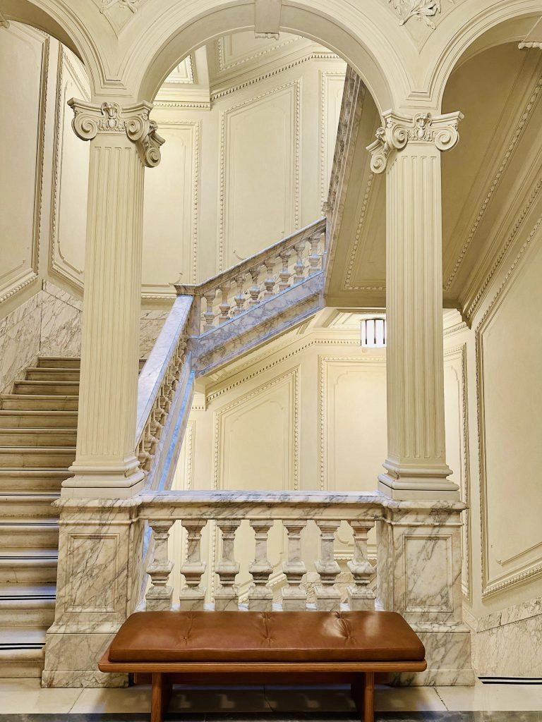 Rather than erase the past, the restoration process—led by architect Patricia Urquiola—revealed it. The Spanish-born designer draws from Rome’s architectural canon, but recasts it in a palette of matte textures and organic forms. Original travertine columns line the lobby, and the stunning, central marble staircase is original to the building’s founding. Vaulted ceilings, curved lines, and custom furnishings offer reverence. Throughout, natural materials—terracotta, walnut, linen—take center stage. The overall aesthetic is tactile. Oversized windows flood interiors with light, filtered through softly textured curtains. Shadow and stone reflect Rome’s rhythm of permanence and ephemerality.
