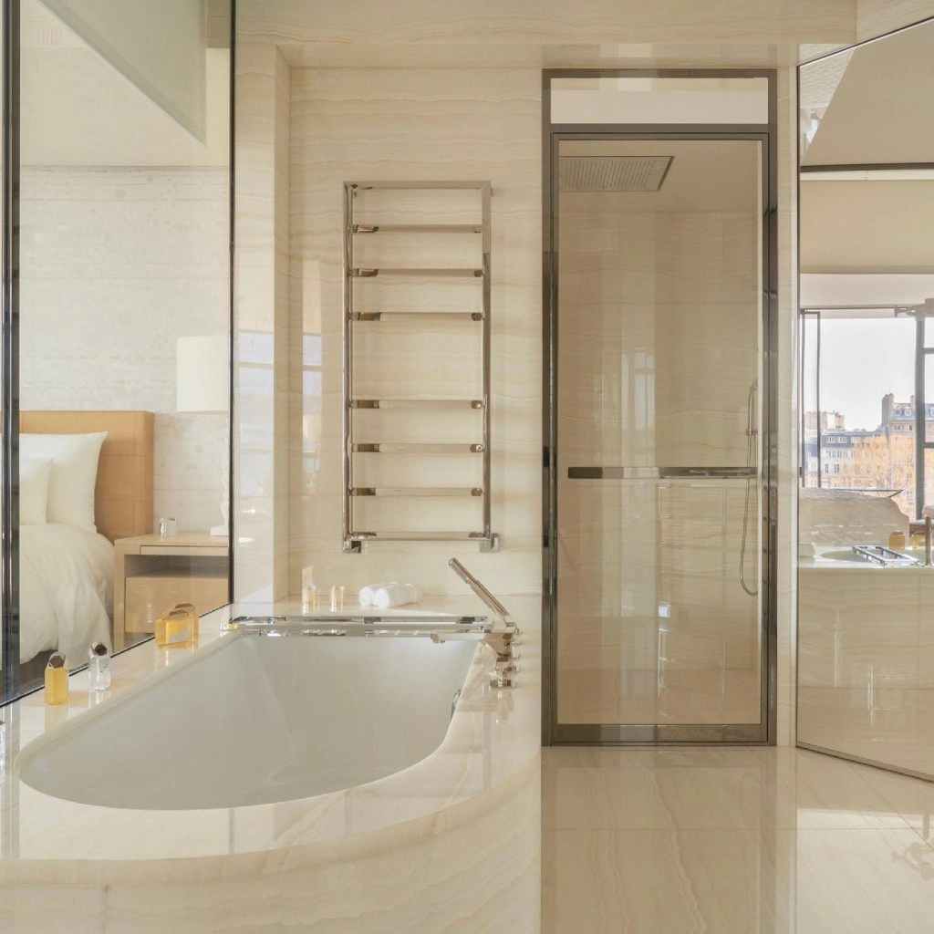 Bath time is a vacation in itself, whether you decide to take a soak or sit in your custom steam shower. You almost don’t need to head down to the spa. But you should anyway, because it’s a Dior production down there, worthy of a few hours between shopping sessions. Also, the pool has a must-see holographic screen of Paris that creates the effect of a rooftop location, even though you’re actually in the subterranean levels of the hotel.