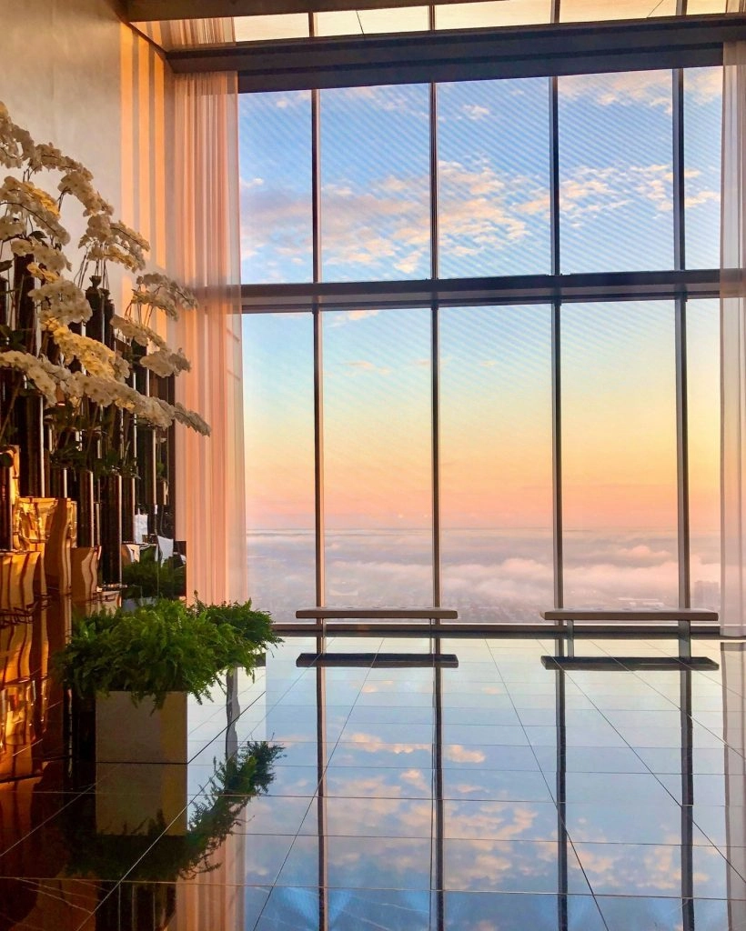 At the 60th floor lobby level are the bar and lounge, and a grand staircase down is the fine dining restaurant. With its mirrors, glass, steel and modern décor, this is one of the more architecturally stunning Four Seasons interiors, of any of the city hotels. Breakfast is in the where you can nosh on caviar eggs and dosas. Daytime lunch or snacks that turn into drinks are a cool, casual yet elevated vibe as you take in the stunning views. At night, the bar transforms into a sexy vibe complete with DJ – this is the place to be for drinks post dinner.