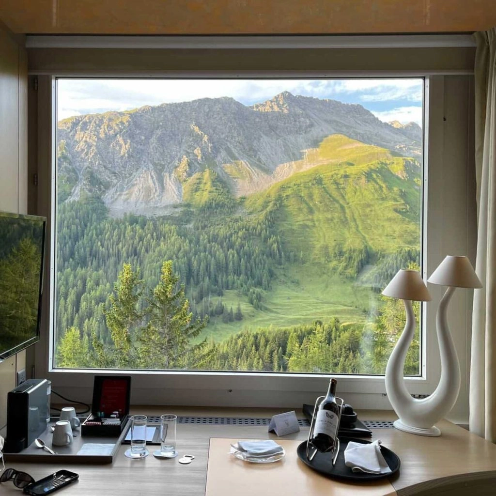 There’s a quiet grandeur to the Tschuggen Grand Hotel that hits you the moment you arrive. It’s not showy, but it’s unmistakably luxurious. The lobby is all alpine elegance: warm woods, soft lighting, and panoramic windows that frame the mountains like a mural. You’re in the Alps, but you’re also in a space that feels curated, intentional, and deeply serene. The vibe here is refined, but not stiff.