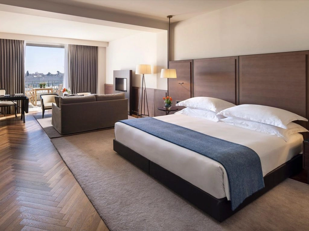 From the moment we walked into the room, there was something familiar about the hotel. Appointments were luxurious from the moment you walk in, with the herringbone floors and top end finishes. There was a cool mural of a city in the entry way and a large separate dressing room area with modern dark paneled doors. The bathroom was a stunner, designed in a light white and grey marble that was contemporary and clean. The room itself had a huge sitting area partitioned off by the dual televisions and cabinet. This separated the bedroom and living room on the open floorplan, which made the room seem larger than it was. The best part though was still to come, where the balcony overlooked the Old City of Jerusalem Walls.