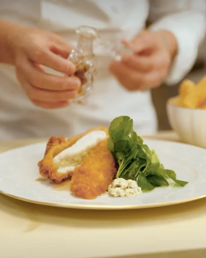 Be British. Grab fish-and-chips wrapped in newspaper to hold fatty fried cod with malt vinegar drizzled on top. The problem is, chippies across the U.K. are closing due to soaring costs. The solution? Go upmarket with fine dining fish-and-chips that break every boundary of what the British classic should be. Come to Corenucopia by Clare Smyth, an elegant new bistro in Chelsea. Dover sole with lobster mousse, mushy peas, and triple cooked chips is £54 ($72).