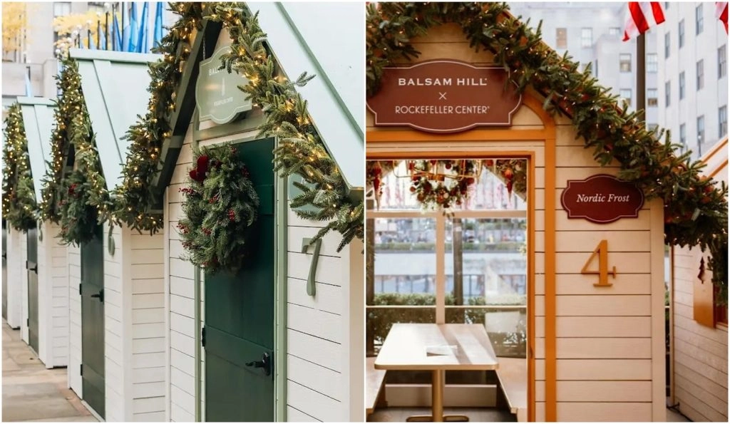 A: Balsam Hill, the company that specializes in high-end artificial Christmas trees and decorations, decorates the Après Skate Chalets at the Rockefeller Center every year.