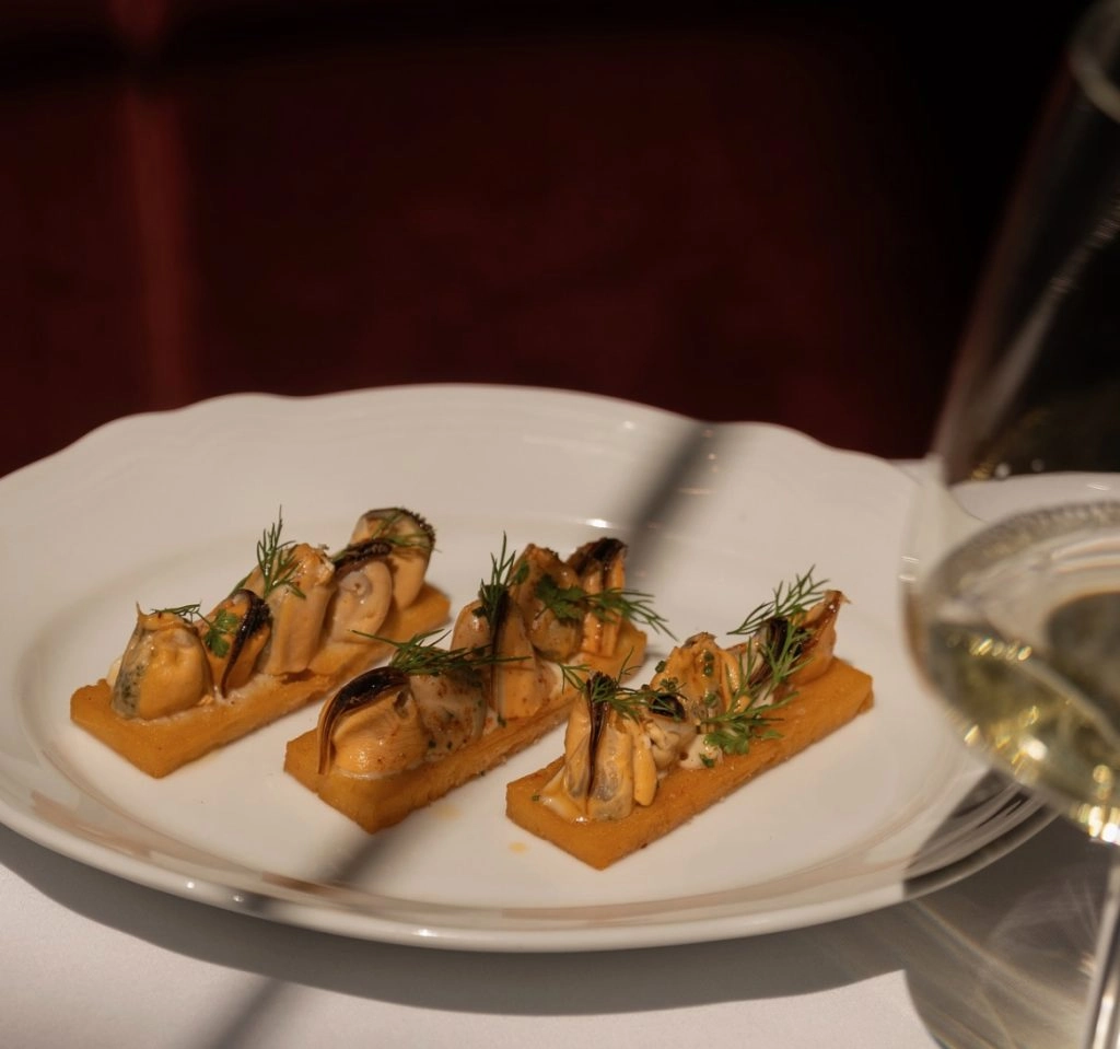 We did a review of Wildair, which is a restaurant I really wanted to love. The nutshell is that I found it disappointing for all the hype. Some of the dishes, in my opinion, weren’t edible. In the case of Brass, I’m more neutral, as I think the jury is still out. I love the concept of their French menu — it’s nice when a restaurant brings back the art of the canapé. The hors d’oeuvres menu is my kind of finger food, in concept. The girlfriends and I ordered the crab tartlets, and moules frites, which is actually a few mindfully dressed mussels on a chickpea panisse. They were darn pretty, but I wasn’t wowed by either canapé.