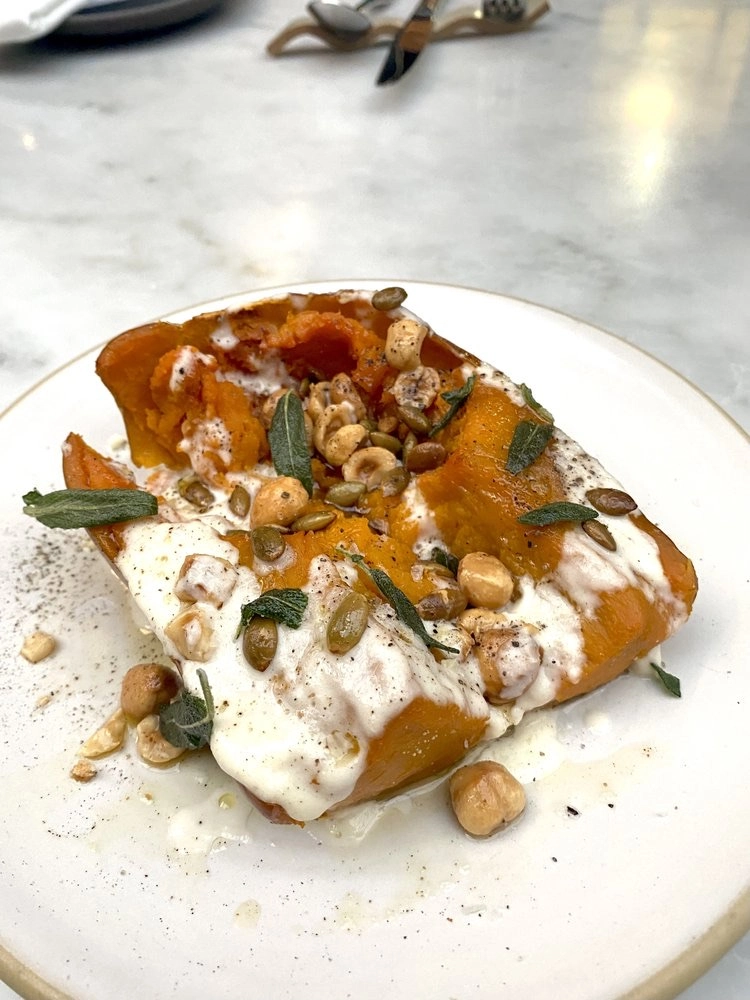 As for dessert, the prix fix menu has four options, while the à la carte offers two. Whichever you choose, the fig gelato sundae is available on both, and it’s a must. Topped with olive oil crumbles and honey whipped cream, it’s the best thing we ate. Honorable mention goes to the yeasted Roman brioche bun filled with crème chantilly. You really can’t go wrong here.