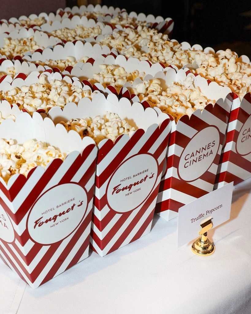 The side tables, while adding refinement to the space, aren’t purely aesthetic. This is where you’ll keep your well-deserved stash of gourmet sweet treats. In the cinema, there is gourmet truffle popcorn in novelty white-and-red striped popcorn containers, soda in glass bottles (because it tastes better that way), and candy pouches from Lil Sweet Treat NYC.