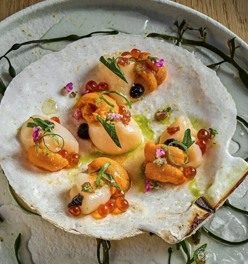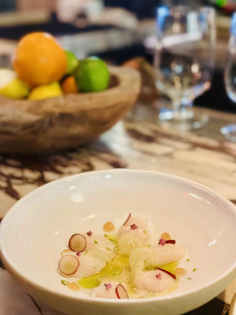 Speaking of preparation, they’re going all in on authentic and fresh, where the scallop is taken live from the shell. The crab is still moving too when it’s cooked. I would only comment that the scallop while also beautifully prepared with thin grape slices and radish needed just a touch of Fleur de Sel. The hamachi had all the Michelin-plating vibes. There was an artful design of avocado and mayo along with a nuanced herb oil drizzled on the plate. I’m normally not into Amberjack as it’s a little fishy for me, but in this case, they cut the fishiness with blood orange citrus slices and micro green cilantro.