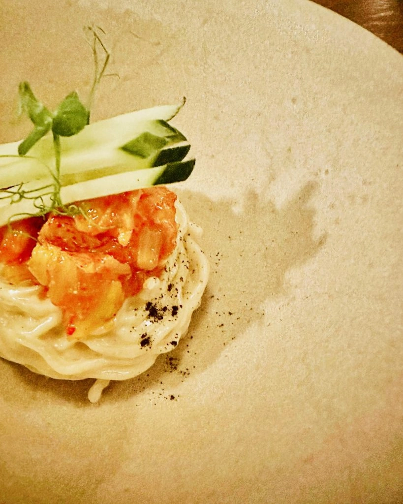 The next course was a cold creamy lobster pasta topped with cucumber. It was ok, though I don’t need to eat that course again. Nevertheless, it was to me, the most Korean-inspired dish of the meal, besides the jellyfish of the second course. For that, I appreciated the dish.