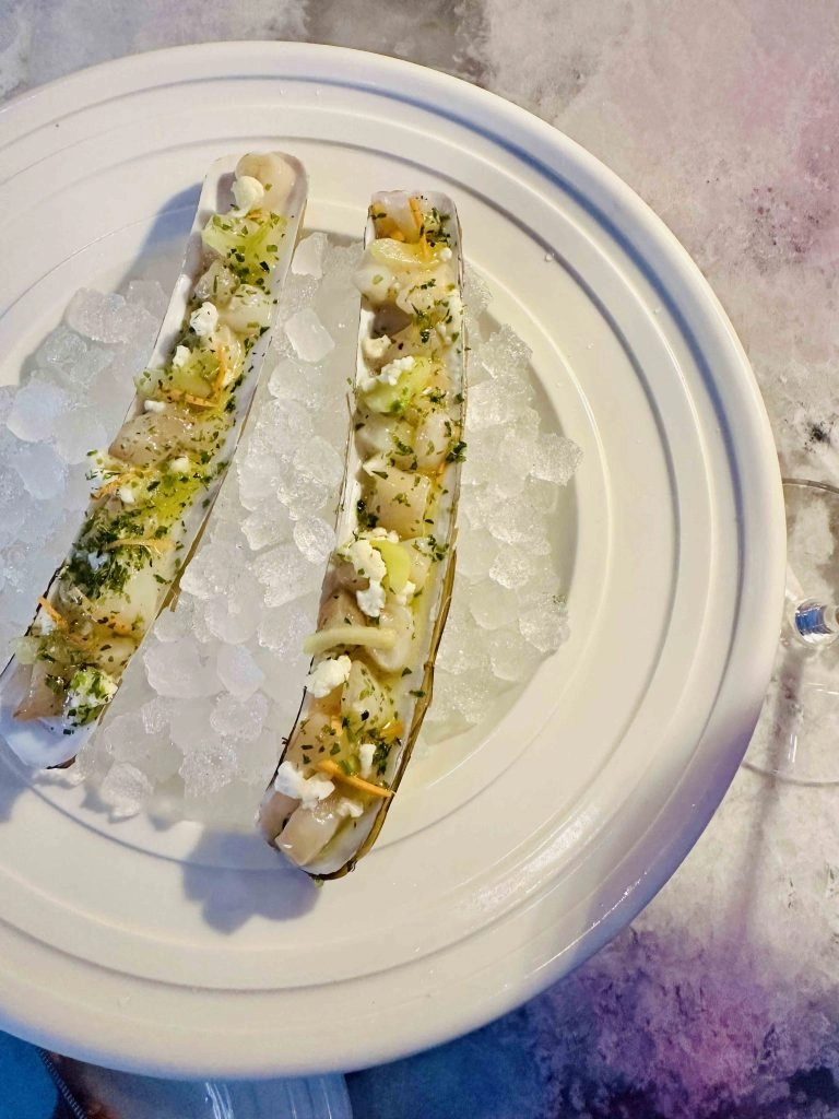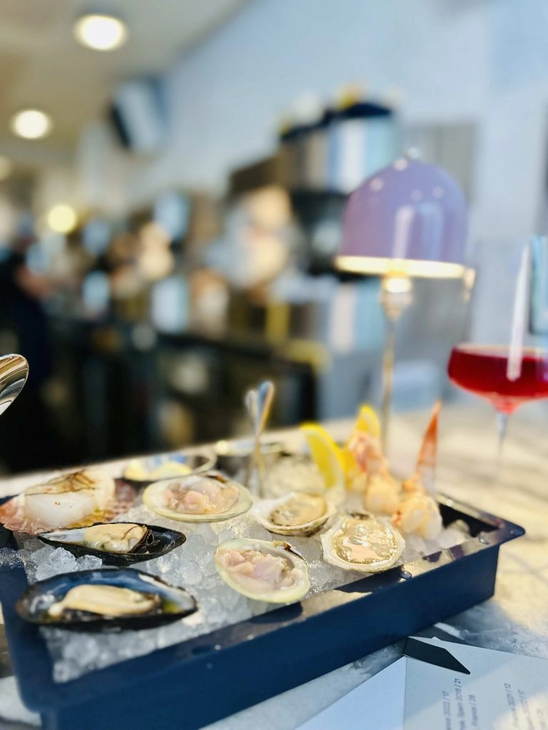 Located on the second floor above the Claud wine bar, Penny has a clear identity from the start. You know you’re entering a casual seafood restaurant, but the attention to detail and the premium materials take the decor to an elevated level. There’s a beautiful bar with a marble countertop that you know is expensive but which is the focal point of the primary bar seating dining room. In lieu of uncomfortable bar seats though, you have custom stools that are sleek in design but are also supremely comfortable. You could sit there for hours if there wasn’t such a long wait as the restaurant is mostly walk-in only. I loved the color accents of the room, particularly the brass and elegant lavender table lamps that are built into the bar. If you are into design and like the less is more approach, you’ll appreciate the atmosphere of Penny.