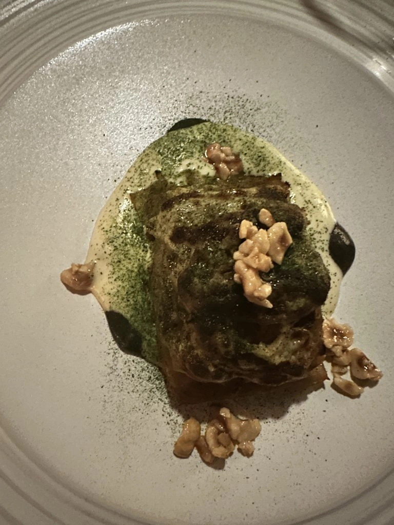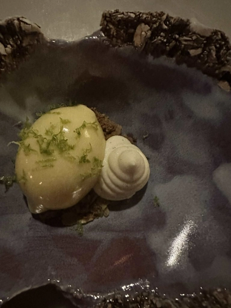I went pescatarian on the menu but my friend went for the full-on tasting as recommended. Both of us swooned – something that never happens – at the simple yet complex preparation of the dishes. The sea scallop at the time had turnip, white miso, yuzu, and horseradish. Now, I can talk about that cabbage, which was prepared with nori, comte, and hazelnuts. I was in food nirvana at the combination, and almost put over the top with the cheddar biscuit and homemade butter served alongside. I am not a big dessert person but their palate cleanser of a key lime crémeux on oat crumble was a winner. They also had an eggnog-baked Alaska which I devoured.