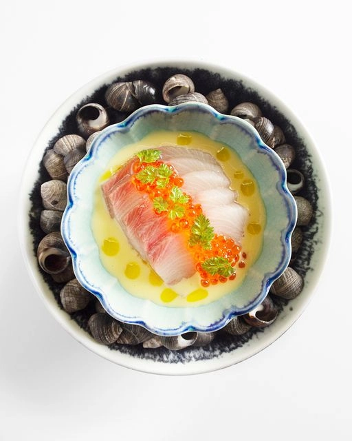 The bites are art on a plate. The shiitake handroll was presented on a shiso leaf with sushi rice and mushrooms that you eat like a taco. The oyster crisp is served in a creamy oyster dip. I found the dip overwhelming as it overflowed out of the shell. It would have been more impactful had there been just a dollop on top, but I still don’t regret the order. The nori chip was a crisp piece of nori filled with tobiko and salmon roe. This was the winner of the bites for my palate.