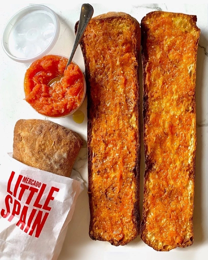 The pan con tomate, patatas bravas, the bikini cuatro quesos and the avocado. The tortilla Espagnol is by far the best in NYC, so it’s a bummer that this is the one dish they currently don’t deliver. Fret not: it’s available (for dine-in guests only) at the Spanish Diner next door. Something about the Great Resignation and not enough people to work. We’re hoping that things go back to normal soon. We miss that tortilla at home, but in the meantime you can check out our recipe inspired by Mercado Little Spain.