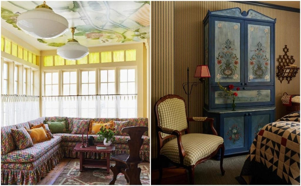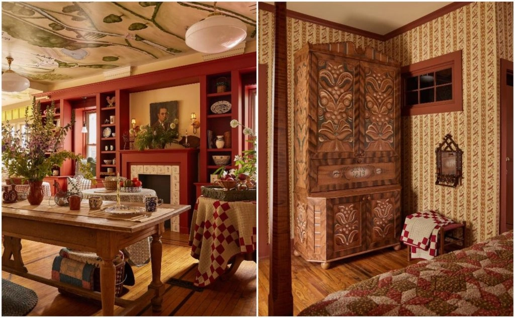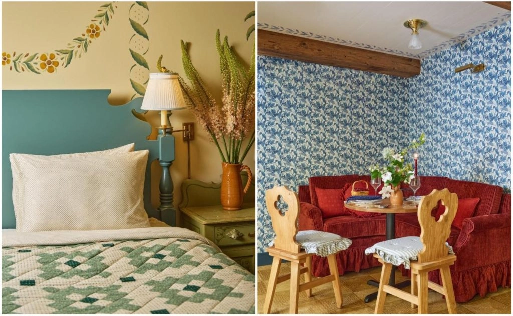 While the exterior of the Six Bells Countryside Inn is cute and eye-catching, it does not hold a candle to what you’ll find inside. Every single inch of the space is covered in wallpaper, hand-painted florals, quilts, ruffled pillows, patterned textiles, simple antique furniture, and vintage decorative objects. It’s the opposite of minimalistic, yet, it’s soothing because it conjures up a feeling of happy, comfortable nostalgia. This inn will take you back to a time when things were made with care, to be both functional and beautiful.