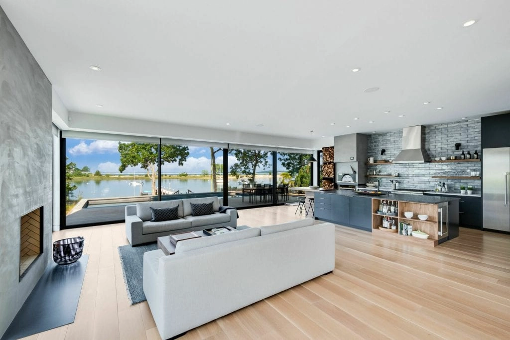 So your time is now, to be in Sag, and we have the inside track on your summer in the Hamptons home on the water. We found this stunner of a new construction, modern home with 5 bedrooms and 6 baths, with expansive floor to ceiling windows. So you get your glass house feeling, while still being comfortably welcoming. Beautifully decorated, the house mixes modern and classic, with homey yet luxurious furniture and amenities.