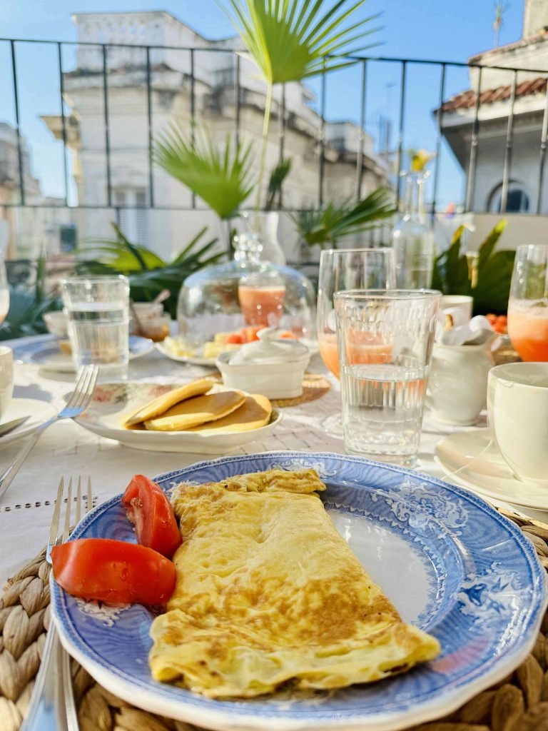 It’s of special note that breakfast is extra special in the main building as it’s served on the duplexed rooftop terrace. It’s special to catch a Havana sunrise at Loma and to have a leisurely breakfast with your travel companions. They set the table with beautiful linens, antique plates, and formal glassware. They put out quite the morning spread as well, with a custom juice, a large fruit platter, pancakes, and eggs to order.