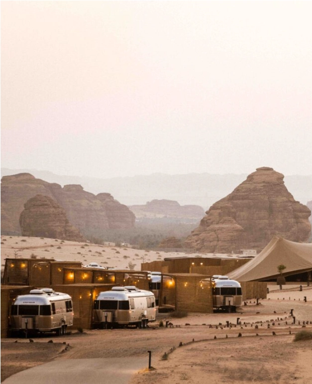 Caravan by Habitas is the more casual, adventure-driven glamping experience in AlUla. Think of it as Habitas’s younger sibling. It’s glamping with a pulse: retro Airstreams, fire pits, and hammocks strung between date palms. The vibe is communal, not curated—guests swap stories over mezze platters and join impromptu jam sessions under the stars. There’s a vintage truck turned juice bar, and the whole place runs on solar power. Fun fact: the site used to be a stop for ancient trade caravans, so technically, it’s been hosting travelers for a few thousand years.