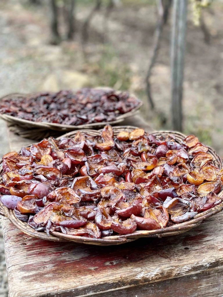 Georgia the first known place in the world where wine was cultivated. The method, known as “qvevri”, involves including the stems, skins and all of the grapes in an underground clay/earthenware pot. With the qvevri method, the grapes go through a natural fermentation process, with no chemicals at all. The skin of the grapes and debris rise to the top and are skimmed off. This process is the same for red and white wine, which is why the white wine has a natural ember tint. It’s otherwise known today as “orange wine”.