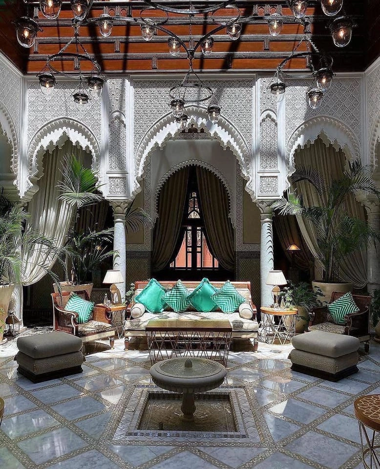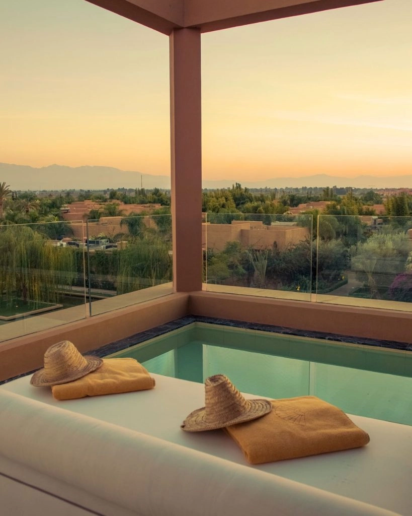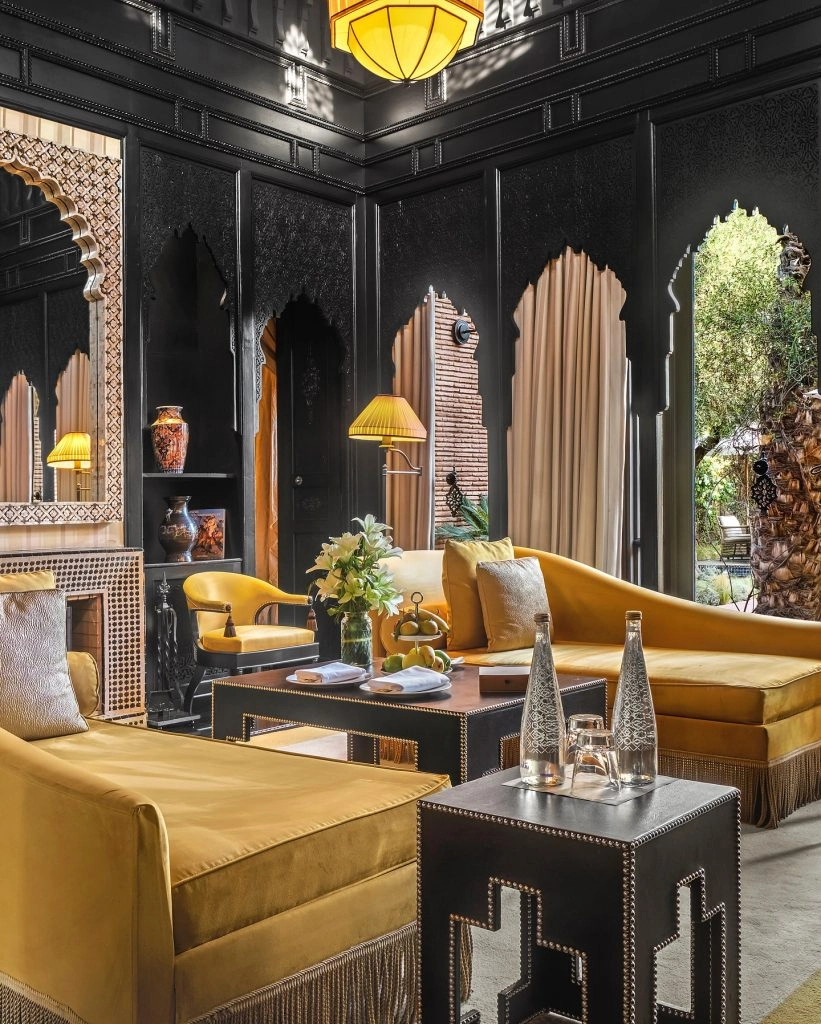 Further away from the city center, you’ll find Amanjena, aka the king’s hangout. The property draws inspiration from the Red City of Marrakech’s storied past. The surrounding gardens create a serenity you can only find when you leave the city center. Think olive groves, fountains, gazebos, and private pools with the Atlas mountains as your view. Amanjena focuses its design on structure more than textiles, with dramatically high archways, pillars, and furniture carvings. They also offer dining nooks throughout the property, whether you choose to have a Berber dinner in an Amanjena tent (after you’ve traveled by camel) or plan a picnic in the olive groves. On a side note, this is a tennis hotspot with skilled LUX coaches, a personal program, and a Petanque Court to satisfy your competitive side.