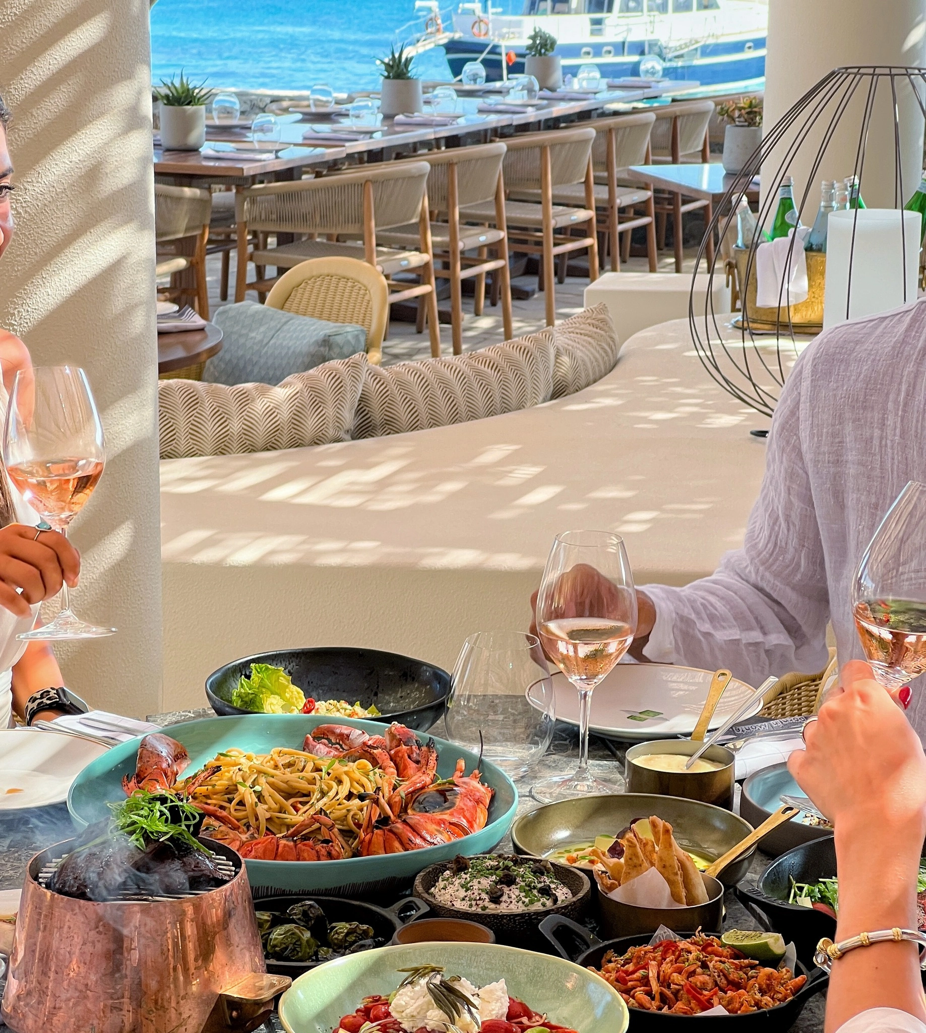 Nōema Mykonos has the best dinner entertainment, where they marry the DJ with live performances. The stunning and vibey environment is right in Mykonos town. The scene is full of beautiful people; servers dress like Greek gods and goddesses, and the music feels more Ibiza. The modern Greek cuisine is even better than the scenery.