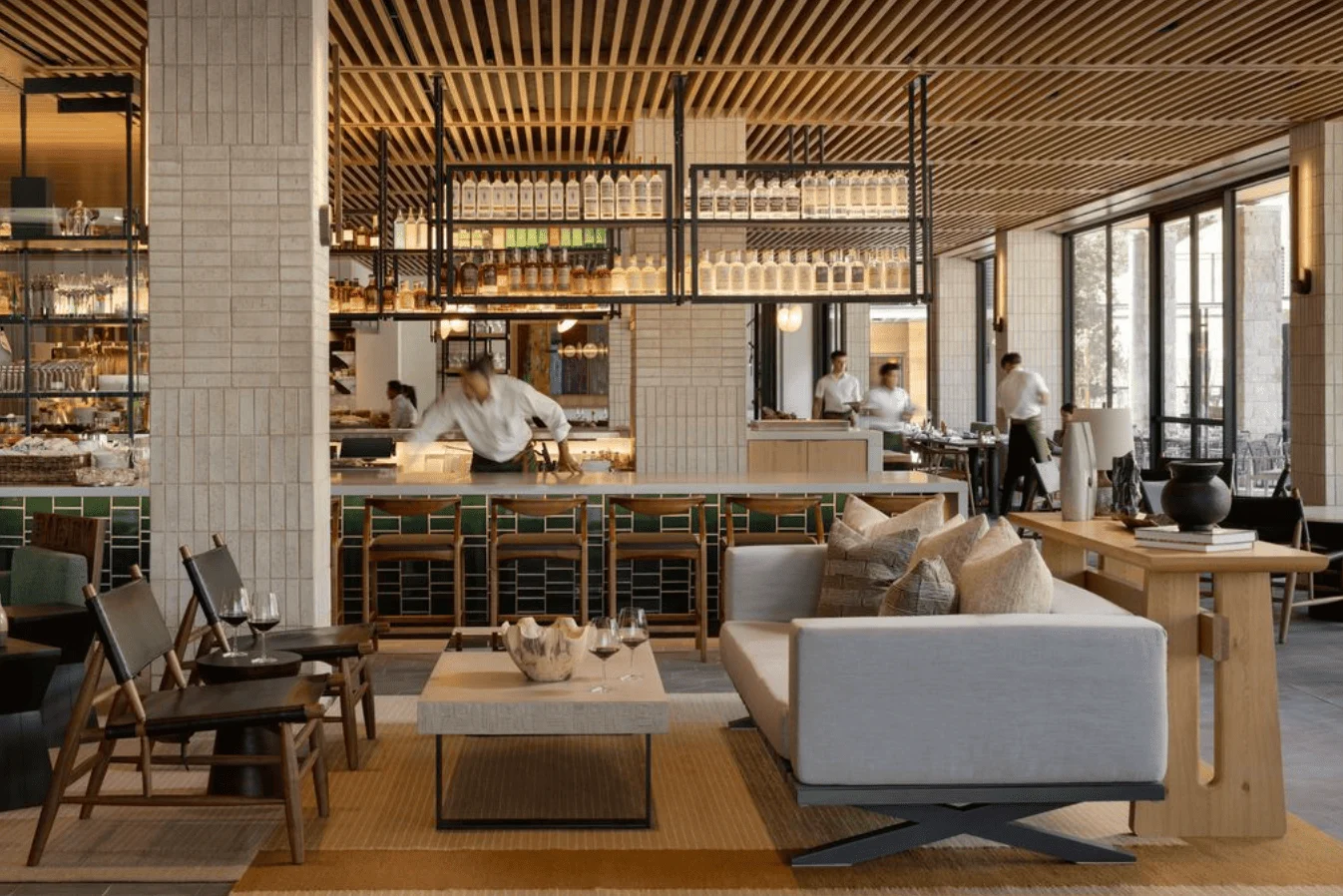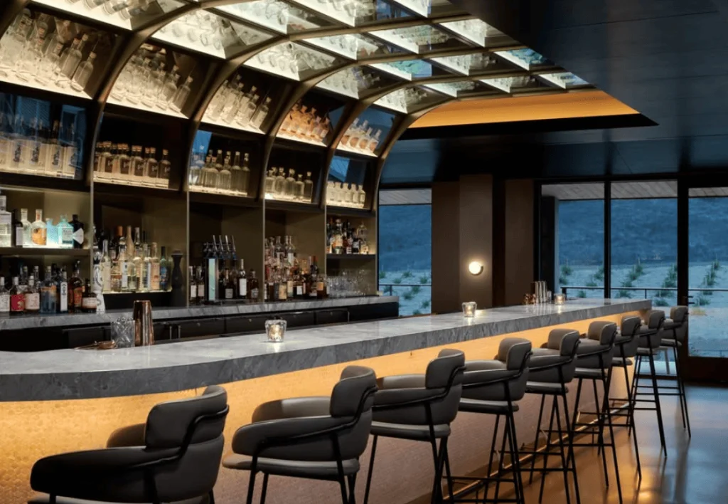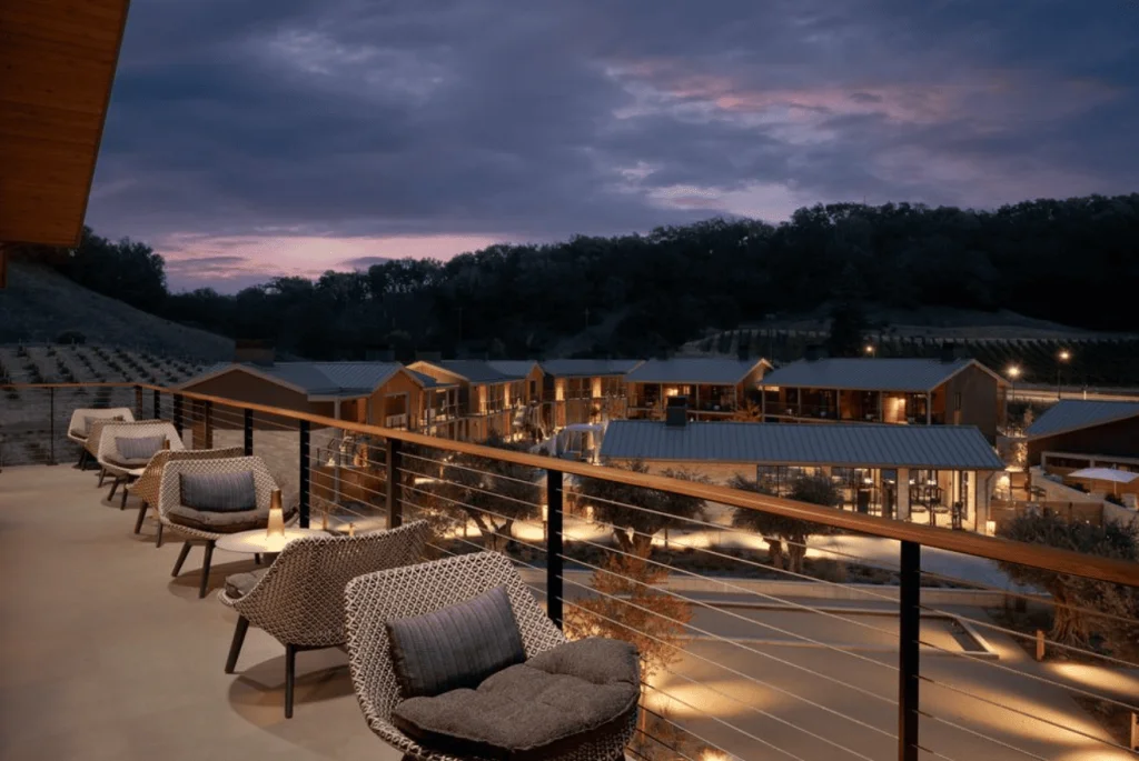Guests gravitate to the lobby’s central open hearth grill in Folia’s dining room, which seats 200 for breakfast, lunch, and dinner. Floor-to-ceiling windows, an open kitchen, and terrace with fire pits, garden beds, olive trees, and fruit trees beyond set the tone for wine country dining. As the day draws in, they may head for the rooftop bar and restaurant. It’s where million-dollar sunsets and stargazing await.