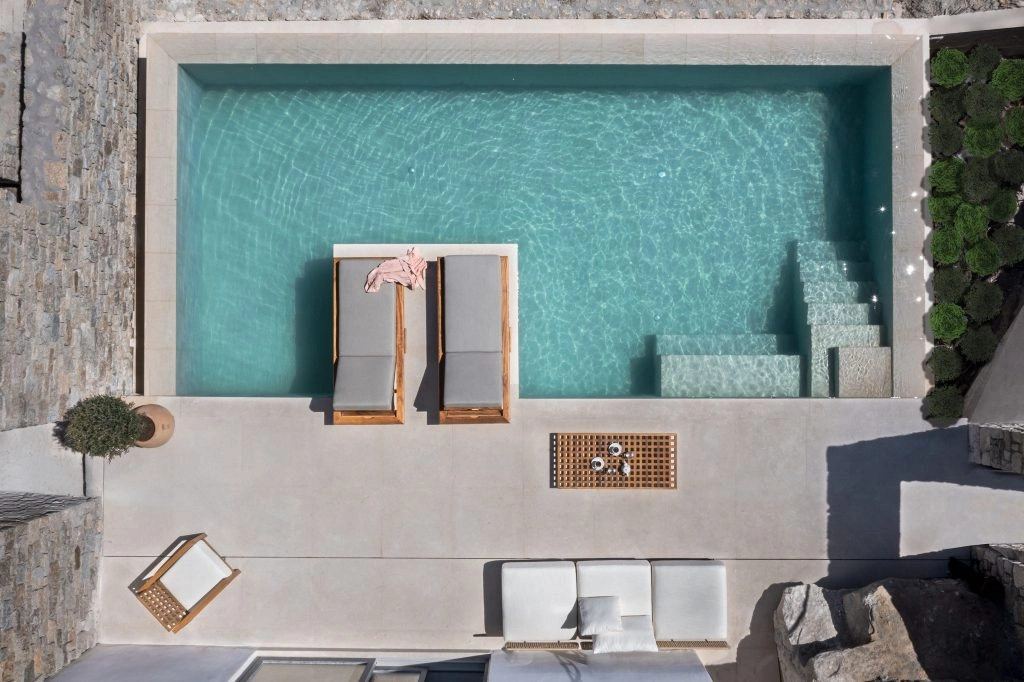 Cali Mykonos has 40 luxury suites and villas up five bedrooms, which makes it optimal for families. Each room comes with its own private heated saltwater pool, which gets lots of use in the hot summer heat. If you’re looking to celebrate something big, (or just roll with large entourage) book the three-level, 2,150-square-foot Cali Villa. The Cali Villa includes five bedrooms (each with its own private pool), and wraparound terraces for guests to soak up the sun and salt air.