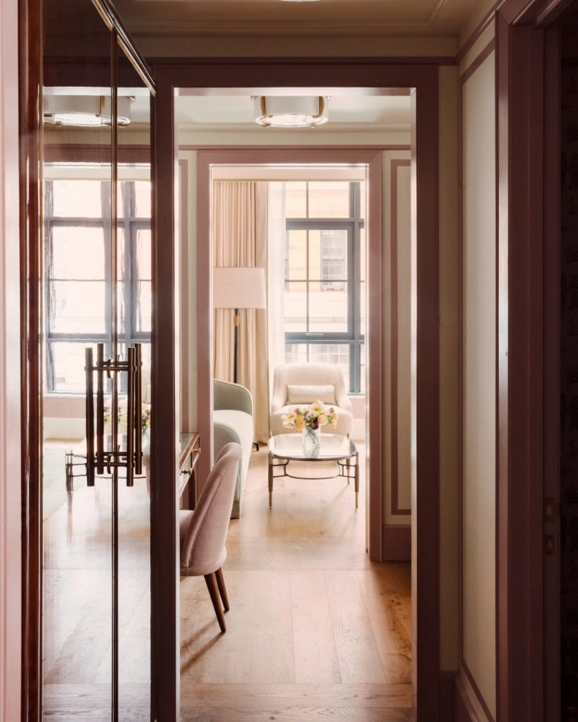 Each hotel in the Barrière portfolio is unique, and Fouquet’s NYC is not afraid to show its feminine side. There’s no doubt that you’re in a French-inspired luxury hotel in Tribeca when you arrive at Fouquet’s. The hotel rooms and common areas are decorated in a palette of pink, lavender and soft green pastels. And Fouquet’s is not afraid to break out the marble, gold mirrors, and velvet, either.
