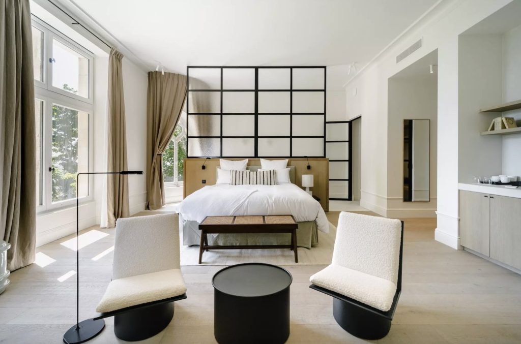 The eight suites available to guests at the moment are in sharp contrast to the historical charm of the exterior. The focus is on natural, neutral colors, minimalist decor, and high-quality, contemporary furnishings. The wealth of natural light and lush views in each of the suites take center stage. The interior exudes a serene atmosphere that’s sure to appeal to overstimulated travelers. In short, if you’re looking for ornate canopy beds and glittery chandeliers, pass your way.