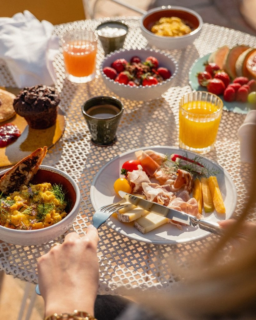 The rooms are exactly how you’d want your beach house to look if you were French and très relaxed: pale walls, terracotta tiles, floaty curtains, and shelves with actual books. No big tech distractions, just soft beds, views of the sea, and ceramic cups that somehow make coffee taste better. Opt for a suite if you want a freestanding tub and more space to flounce around in your robe. Turndown service includes a homemade lavender pillow mist, which is something you didn’t even know was necessary — but it so is.