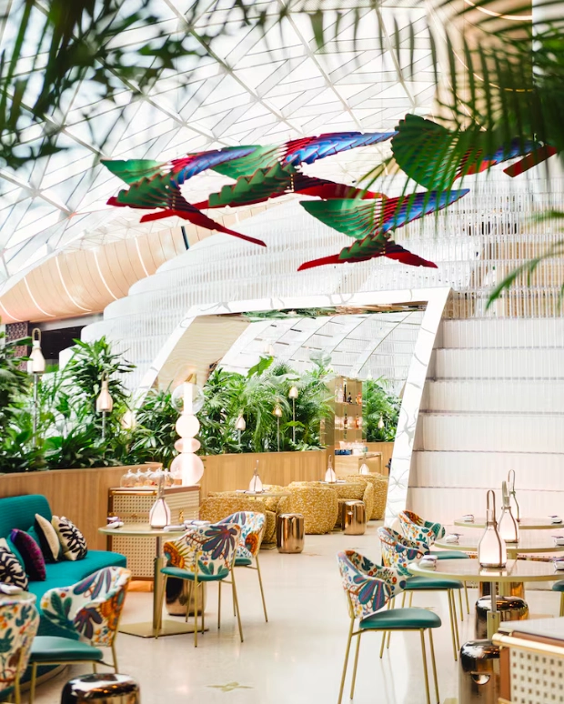 Louis Vuitton is not one to skimp on luxe design and amenities. And that’s true even in a place that many travelers consider more stressful than glamorous. The Louis Vuitton Lounge Doha combines luxury and convenience for jetsetters looking for a comfortable place to wait for their next flight. You can lounge on chic furniture (monogrammed with Louis Vuitton’s logo, naturally) among curated art pieces and lush foliage, which create a tropical vibe.