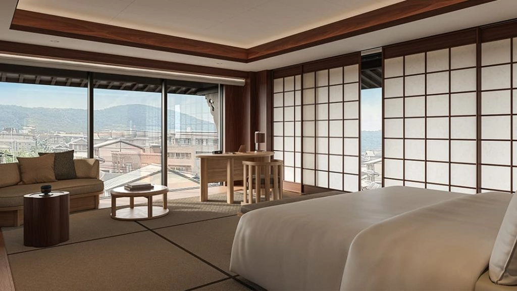 The interiors are less about hotel theatrics and more about restraint. We’re talking tatami, cedar, soft shadow — all leaning in to Kyoto’s aesthetic soul. Every element, from the ceramics to the paper lanterns, is crafted by local artisans.