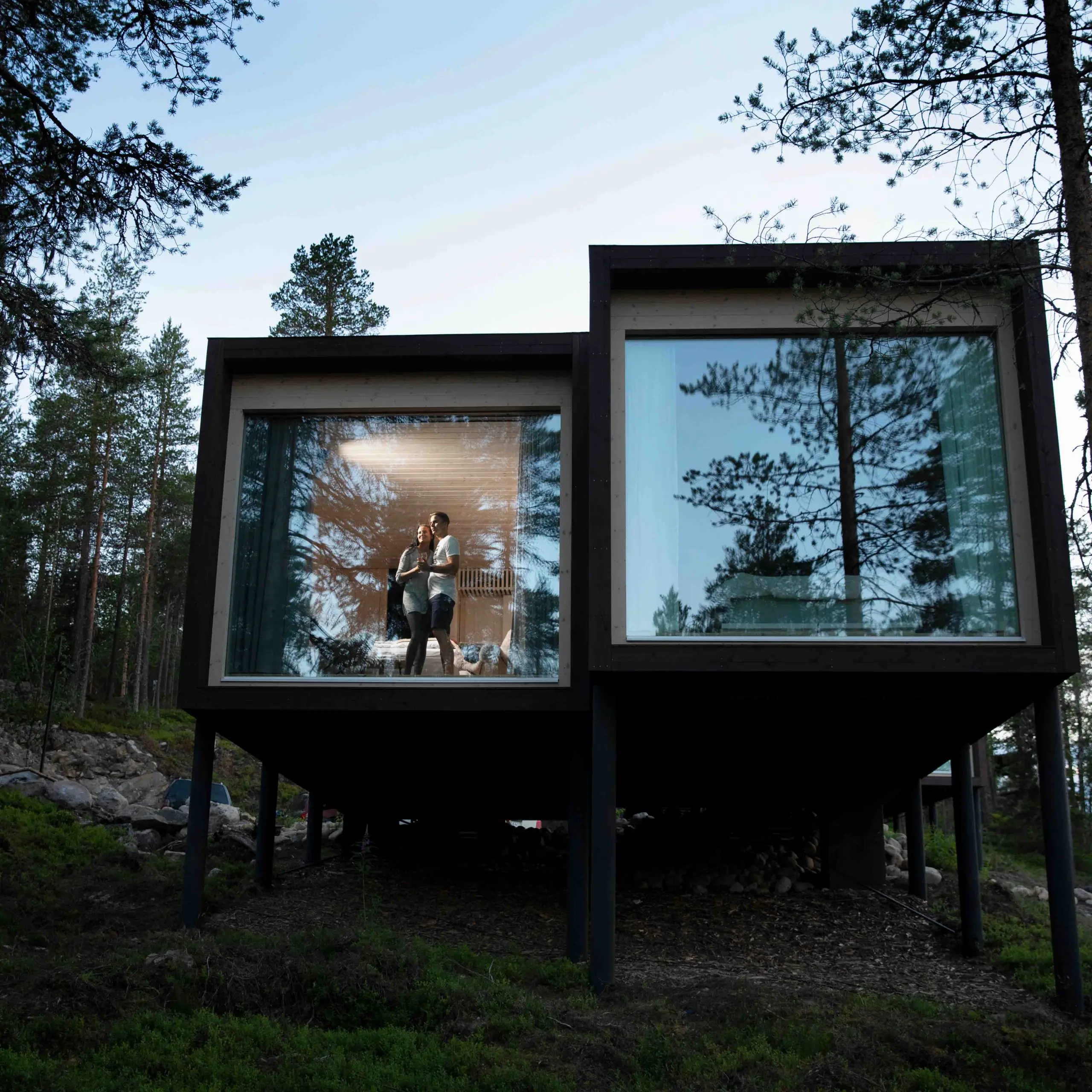Known for extensive wilderness, Lapland has summer activities including reindeer farm visits, photography hikes, canoeing, and traditional sauna boat experiences. About 75 miles from the golf course, book Arctic TreeHouse Hotel and restaurant, Rakas. Deep in a pine forest, cozy guest suites have floor-to-ceiling windows to take in the sights and scents of the Nordic woodlands.