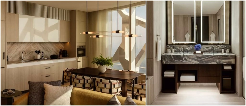 Inside, the decor is a perfect example of quiet luxury. There’s nothing garish, nothing glittery, and nothing tacky. It’s all about high-quality furnishings and textiles in neutral and muted colors. Yes, there is veined marble in the bathrooms and in the kitchens, but the spaces remain modest – there isn’t a gold toilet or tap in sight. Despite their substantial square footage, every room, suite, apartment, and residence in the property exudes a feeling of comfort and cocooning, so you can feel right at home.