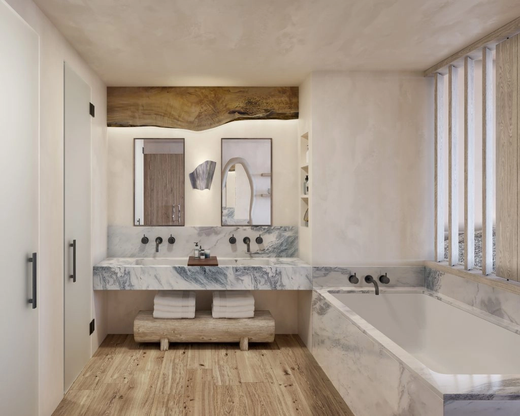 Architects Vault Design created 77 accommodations for the resort, including guest rooms and suites. There will also be 24 residences, spanning from two to five bedrooms. A gym, cinema, lounge, and game room are also accessible to guests. The design incorporates natural elements like cedar and local stone, and lighter colors symbolize the purity of the nature surrounding the resort.